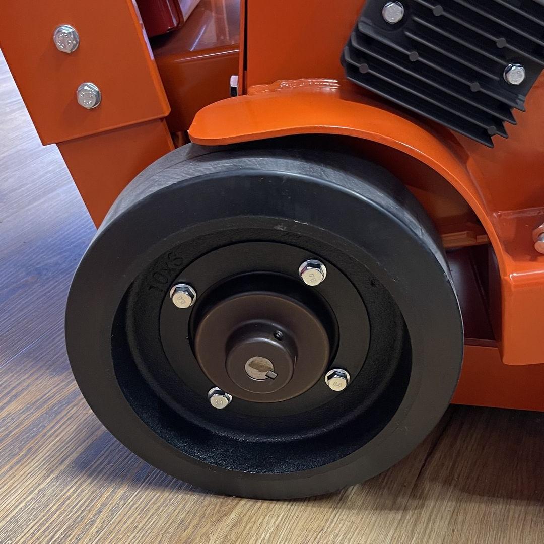 Duże, żeliwne koła z gumowymi oponami w Husqvarna FS 524 zapewniają stabilność i łatwość manewrowania na różnorodnych powierzchniach, co ułatwia transport i zwiększa mobilność urządzenia.