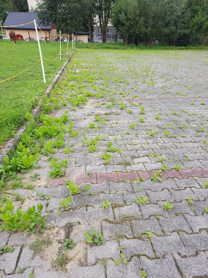 Przykład użycia maszyny na placu z kostki brukowej po lewej przed i po prawej po użyciu.